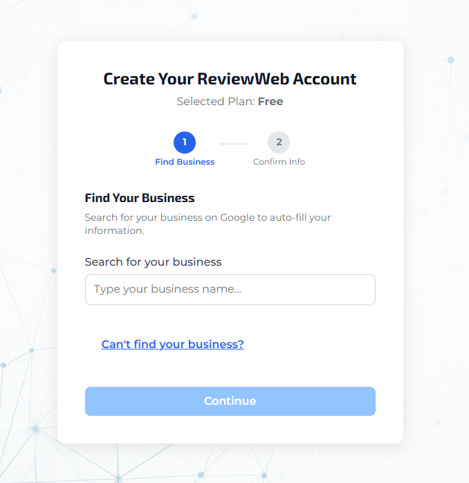 Sign up in under 60 seconds. Search for your business, we connect with Google, and we'll pull in your details automatically. No credit card required to start.